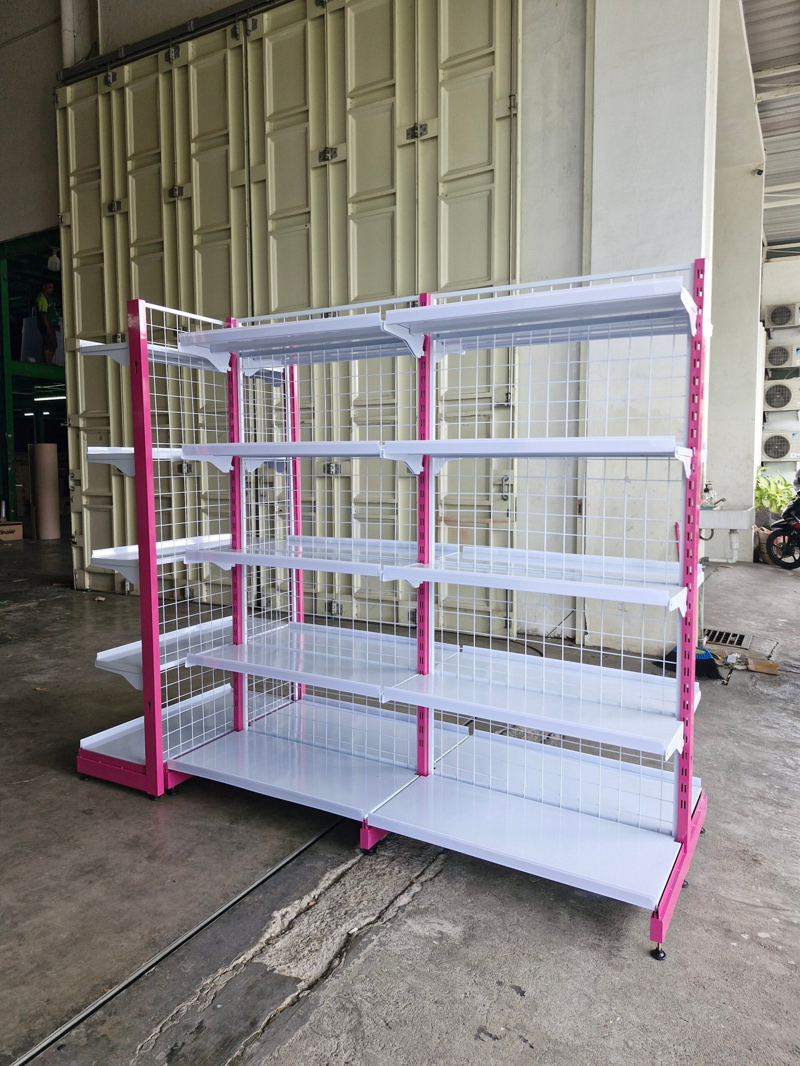 - Rak Gondola Satu Sisi: Cocok untuk area yang terbatas, hanya memiliki satu sisi rak.
